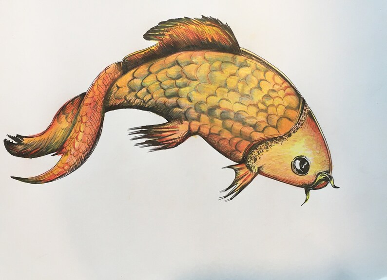 Koi come in tons of color variations, but the most popular is a white base with gold or red splotches koi fish drawing color. Original no thoughts betta fish framed drawing colorpencil etsy.